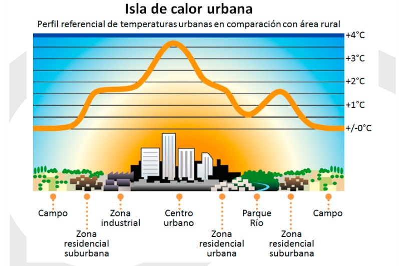 - The lack of green spaces, the materials used in the construction of waterproof pavements such as hydraulic concrete and dark-colored pavements such as asphalt, which in addition to being waterproof is highly polluting.